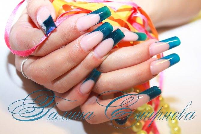 Рассматриваемый вариант изначально являлся разновидностью давно известного френча, для которого характерно оформление свободного кончика ноготка гелем, краской, лаком и другим средствами. Но в данном варианте необязательно придерживаться привычной розово-белых тонов и не обязательно оформлять только кончик. Уже давно распространенный французский нейл-арт вышел за свои классические рамки и теперь позволяет сочетать несколько стилей в себе.