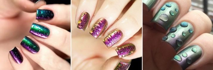 Покрытие металлик или хамелеон смотрится не так агрессивно в оформлении свежих капель прозрачной воды. На ногтях квадратной формы дизайн смотрится вполне выигрышно.