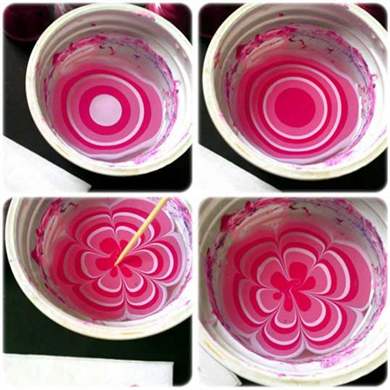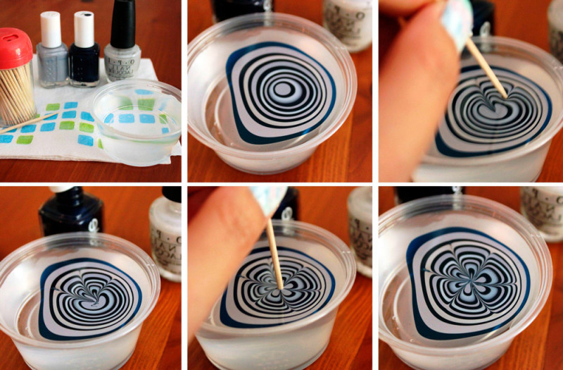 Можно использовать для этой же цели вазелин, клей ПВА или скотч, кому что удобнее. Капаем один из лаков на поверхность воды, ждем пока он немного растечется, повторяем то же самое со всеми выбранными цветами лаков. Затем зубочисткой, смоченной в жидкости для снятия лака, рисуем на пленке из лаков узор. Здесь главное придерживаться золотой середины – слишком много линий и элементов сделают узор наляпистым, малое их количество не позволит получить эффект мрамора. С опытом придет понимание того, какие узоры наиболее эффектно выглядят