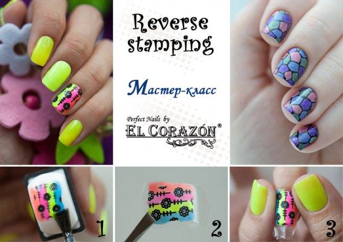 то у нас естьхороший мастер-класс с пошаговыми фото выполненный в технике Реверсивный стемпинг. Перед Вами открываются необыкновенные возможности сделать красивый многоцветный маникюр с аккуратным орнаментом с помощью любых лаков. Но Вам потребуется дополнительное оборудование — набор для стемпинга, который включает в себя диск, скрапер и лак для стемпинга.