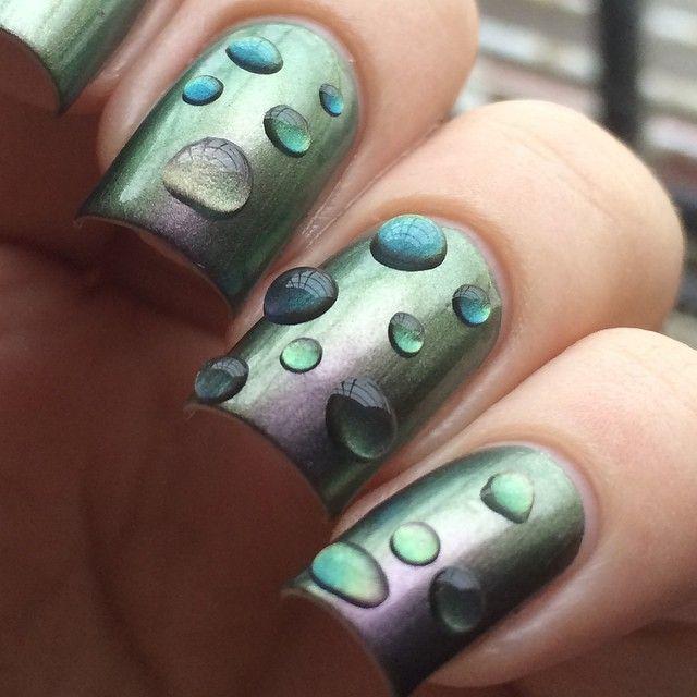 Далее с помощью дотса нанесите топовое покрытие, должны получиться хаотично расположенные кружочки, и просушите под лампой. Высохшие ногти слегка протрите средством для снятия лака, таким образом удалится «зелёный хамелеон» с основной поверхности, а капли сохранятся и будут стильно переливаться на чёрном фоне. Такой маникюр позволяет добиться эффекта дождя.