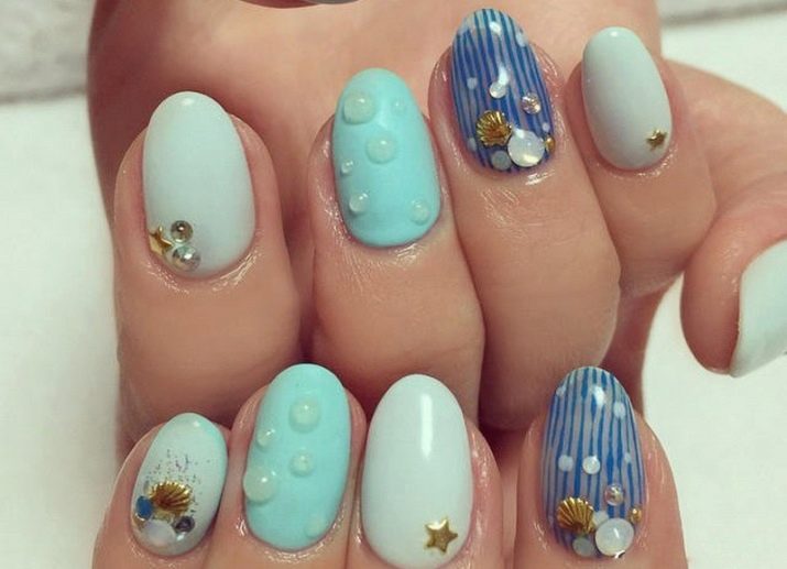 Для создания водного дизайна понадобится контрастная гамма оттенков. Подбирая лаки для этого маникюра, следует обратить внимание на сочетаемость цветовых оттенков. Водный дизайн можно создать минимум из 2-х основ, например: