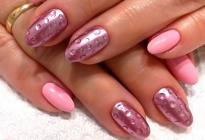 Это самый простой вариант создания капельного маникюра. Есть много разновидностей «брызг»: от прозрачных до перламутровых.