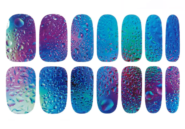 - Самый быстрый способ нанесения капель – использование для дизайна ногтей специальных объёмных наклеек. Сегодня в продаже есть и бесцветные, и с лёгким отливом (зелени, серебра). Можно посмотреть, как смотрятся такие капли на ногтях на фото, и выбрать более интересный для себя вариант дизайна. Кстати, капли из наклеек могут быть как основным рисунком, так и дополнительным элементом украшения в нейл-арте.