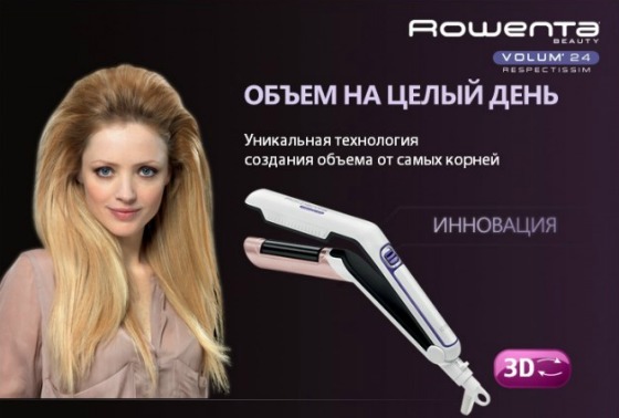 Волюмайзер – это один из современных видов стайлеров для объма. Его ключевым различием от бесчисленных остальных устройств для укладки является присутствие ручки и изогнутой рабочей поверхности. На рабочей поверхности установлен вращающийся черный ролик, тот, что нагревается при подключении прибора к сети. Скажем, так работает Rowenta Volum’24 Respectissim. Необходимо подметить, что локоны нагреваются округлым роликом только у корней, по каждой остальной поверхности пряди вытягиваются фактически, как утюжком.