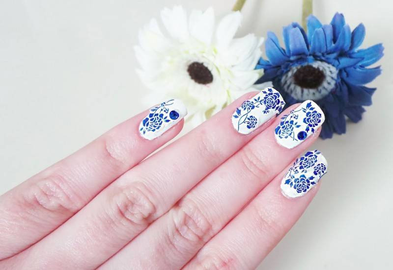 Рисунки на пластинках ногтей в дизайне гжели, жостовских подносов уже использовалась и раньше. Применение плоских кистей знакомо давно. Неповторимость китайской манеры — проведение мазков сразу несколькими цветами. Это создает объемные реалистичные изображения растительных элементов.