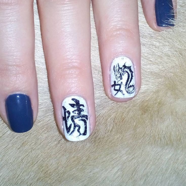 Зачастую китайские иероглифы являются частью сложного дизайна, в котором могут играть главную или второстепенную роль. С помощью разнообразных символов можно создавать восточный, японский утонченный маникюр.