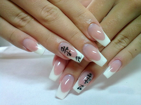 Современная тенденция в маникюре — это классический френч с иероглифами, в котором предпочтение следует отдавать пастельным тонам для основы и черной краске для знаков и элементов.