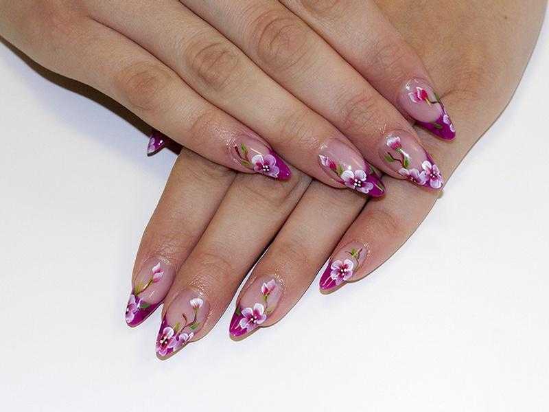 Техника росписи сложна, но мастера создают такие сочетания цветов и росписей, что каждый маникюр становится эксклюзивным произведением искусства. Цветы выглядят как живые, яркие сочетания погружают нас в мир восточной природы.