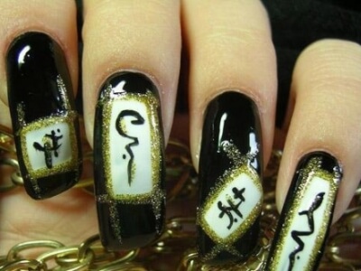 Можно комбинировать и красные, черные тона основы, на которых рисуют иероглифы золотыми цветами на ногтях. Если женщина предпочитает смелый и загадочный маникюр, всегда следит за тем, какое модное веянье с собой приносит новый сезон и что сегодня в тренде, ей как раз и подходит такой оригинальный дизайн.