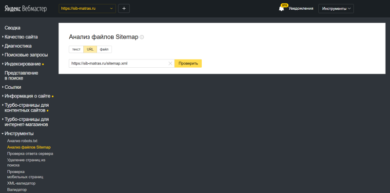 Чтобы проверить карту в «Яндекс.Вебмастер», зайдите в раздел «Инструменты» — «Анализ файлов Sitemap».