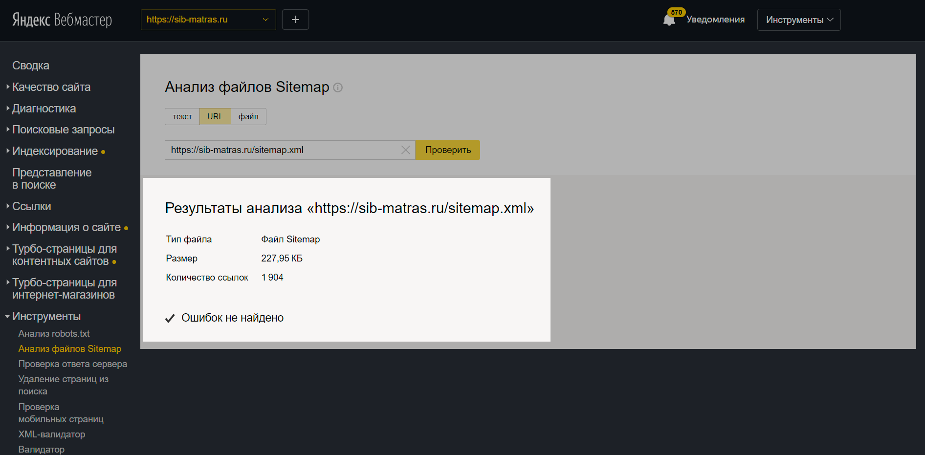 Чтобы проверить карту в «Яндекс.Вебмастер», зайдите в раздел «Инструменты» — «Анализ файлов Sitemap».