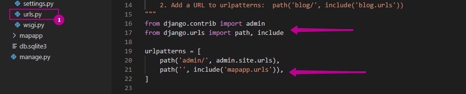 В папке ‘mapapp’ создадим файл ‘urls.py’, который будет содержать маршруты и функции. Их мы создадим позже: