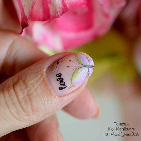 Дизайн можно делать сразу поверх базы, нанесенной в два слоя. Для примера я решила нарисовать вот такую бабочку с использованием двух других цветов гель-лаков Fiore и гель-краски паутинки, а также наклеек с надписями, и перекрыть все это матовым топом.