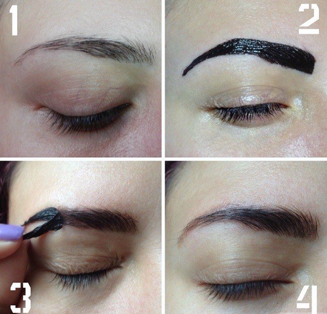 На кисть наносится требуемое количество тинта, затем он распределяется по поверхности бровей так, чтобы пигмент не попал за поверхность контура. При помощи состава можно корректировать форму дуг, исправлять асимметрию, менять форму и изгиб. Для этого требуется предварительно разметить контур, а потом – закрасить его.