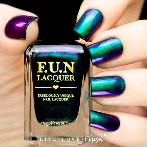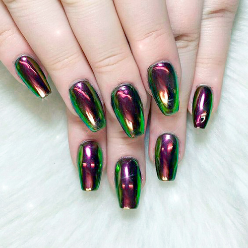 Оттенок «майский жук» оригинально смотрится на ногтях любой длины. Своеобразное название покрытие получило из-за сходства с окрасом спинки насекомого (классический вариант – переливы от фиолетового до зеленого).