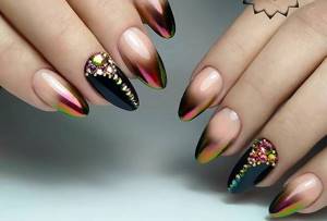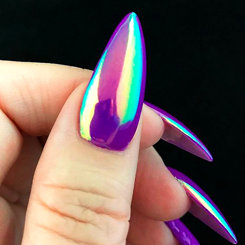 Для гель-лака отлично подходит голографическая пудра. Втирка «призма» отличается эффектным результатом. По внешнему виду итоговое покрытие напоминает разводы бензина на водной поверхности.