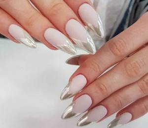 - Металлик. Втирка позволяет сделать зеркальный дизайн ногтей. В баночке она выглядит как металлическая пыль серебристого, платинового или медного оттенка, но при нанесении на ногтевую пластину создается эффект переливающегося «волшебного» зеркала.