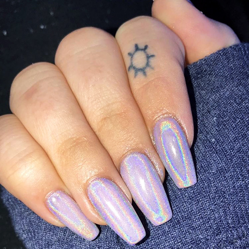- Голограмма. Разноцветная пудра мельчайшего помола подходит только для декора гель-лака или наращенных ногтей. Особенно неудачным вариантом считается натуральный розовый цвет ногтей, дополненный втиркой-голограммой.