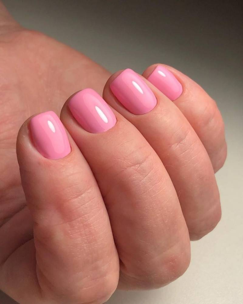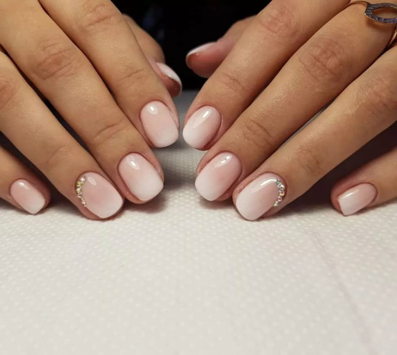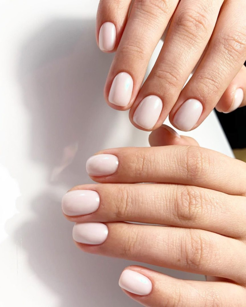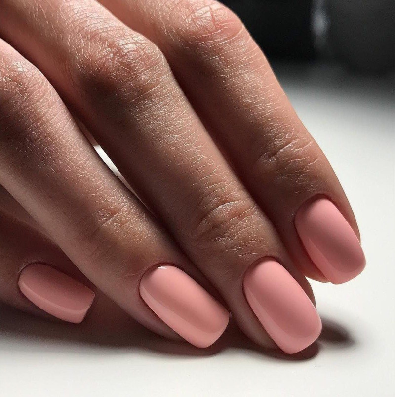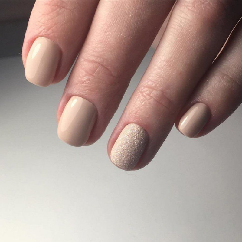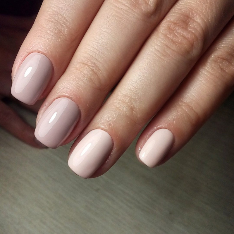 Чтобы сделать элегантный маникюр на коротких ногтях, мастеру достаточно покрыть ногтевые пластины одним светлым тоном. Лучшего всего выбрать какой-нибудь нюдовый оттенок.