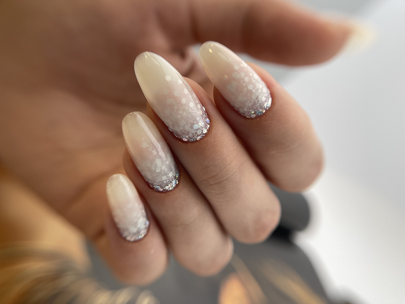 При работе с блестками не всегда есть смысл усложнять дизайн – достаточно покрыть ими нюдовое покрытие.