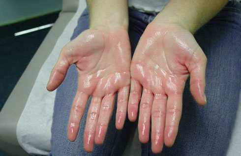 Избыточная потливость ладоней или локальный гипергидроз встречаются одинаково часто у обоих полов в возрасте от 15 до 55 лет, частота не превышает 1%