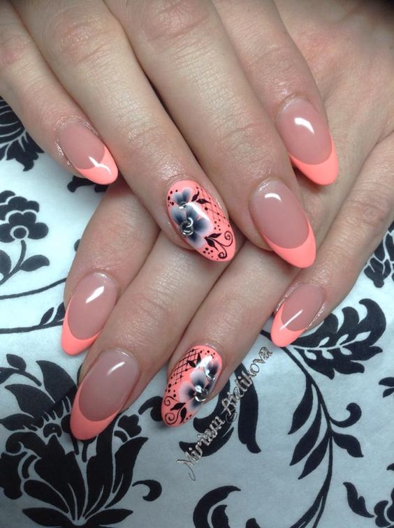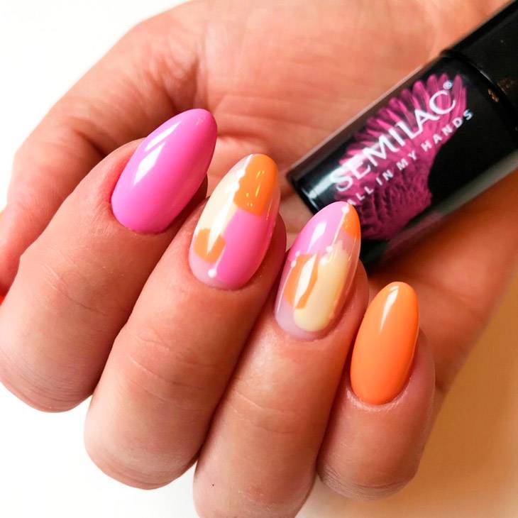 Розовый в дуэте с оранжевым, выбор решительных натур. Дизайн оформляют геометрией, омбре, градиентом или лунным. Для работы подойдет приглушенный нейл-арт, а на праздники возможно выбрать яркий вариант.