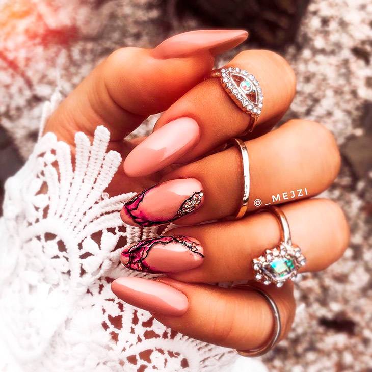 Один из самых элегантных дизайнов, ставших настоящим хитом еще несколько лет назад и до сих пор удерживающих лидерские позиции, является мрамор. Особенно стильно он смотрится на полупрозрачной розовой базе. Так ты убиваешь сразу двух зайцев. Во-первых, мрамор на белой или черной подложке — это довольно банально. Во-вторых, так можно удачно совместить стремление остаться в рамках сдержанного маникюра в нежно-розовых тонах и крутой дизайн.