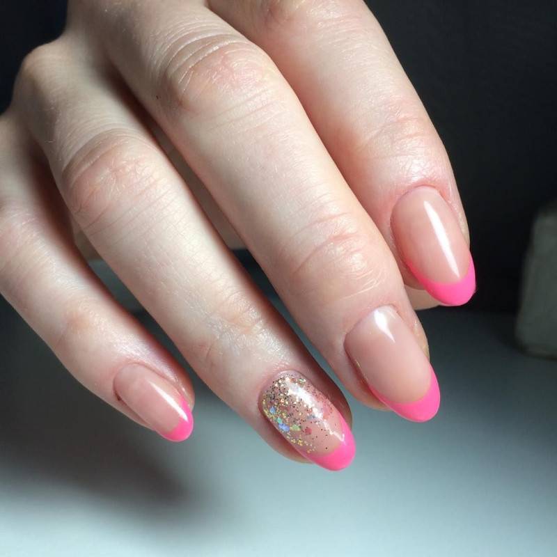 Маникюр с однотонным дизайном розовыми блестками/фольгой всех пальчиков подходит загорелой и бледной коже. А если хотите экспериментов, попробуйте блестками украсить только кончики ногтей, выполнить растяжку или дизайн.