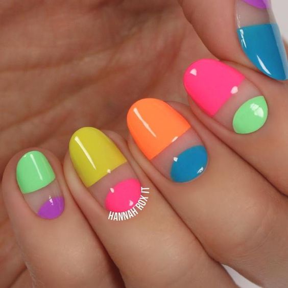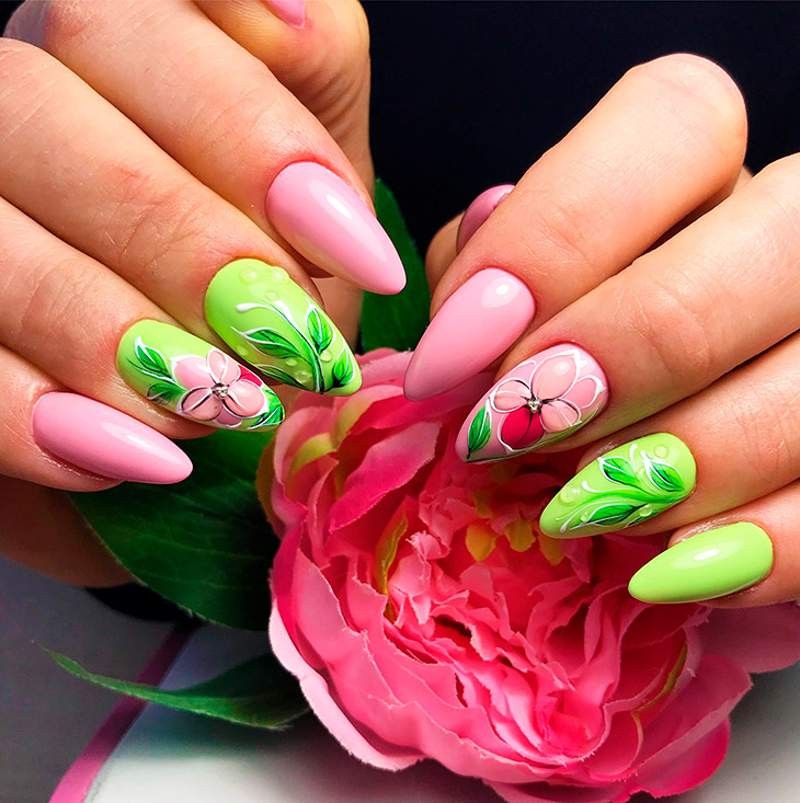 Зеленый подойдет для вечеринки или отпуска. Дизайн делается в неоновых цветах, ярких или пастельных. Для офисного дресс-кода, яркие оттенки будут неуместны. С пастельным выбором цветов, где розовый основной, а зеленый дополнительный, может подойти для работы.