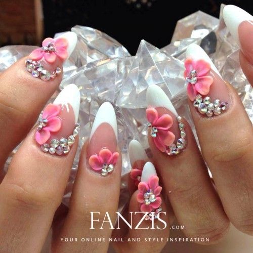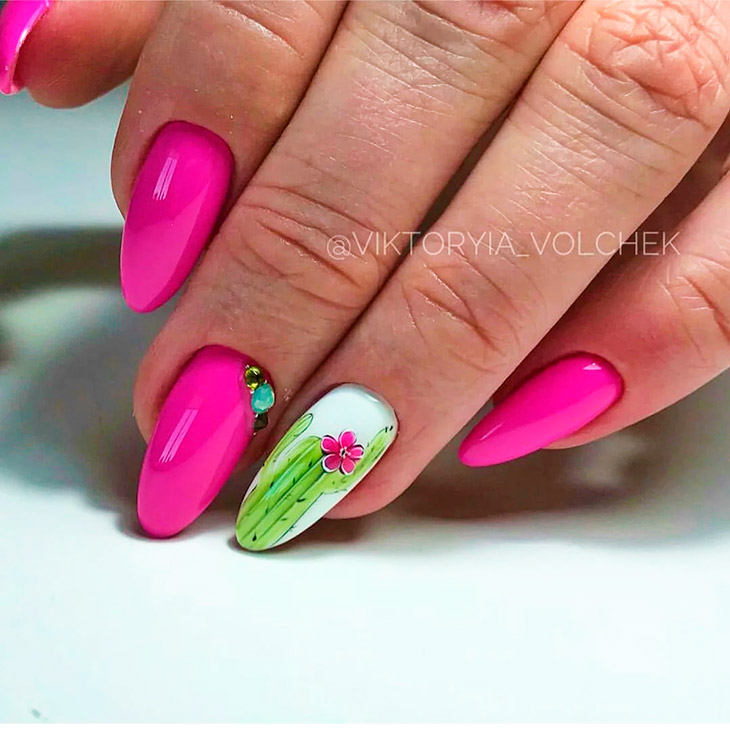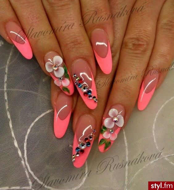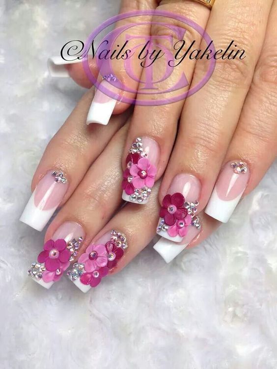 Тем, кто любит обратить на себя внимание и блистать в самом эпицентре праздника, могут понравиться варианты ярко-розового цветочного маникюра, дополненным стразами или блестящим акриловым напылением