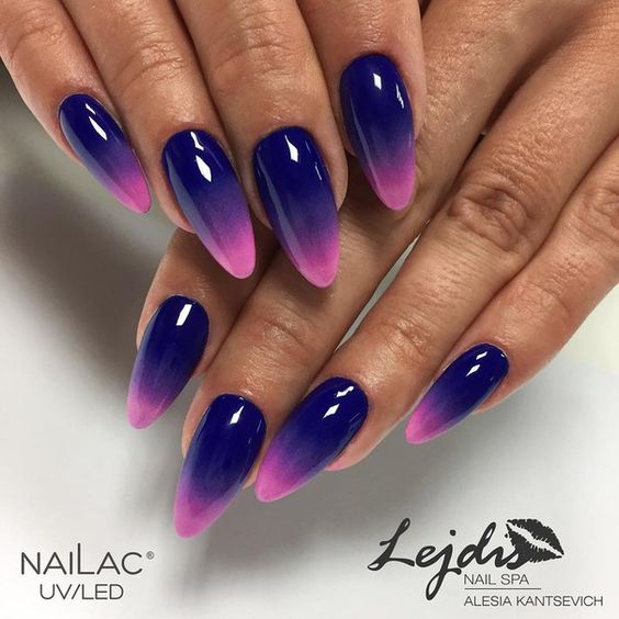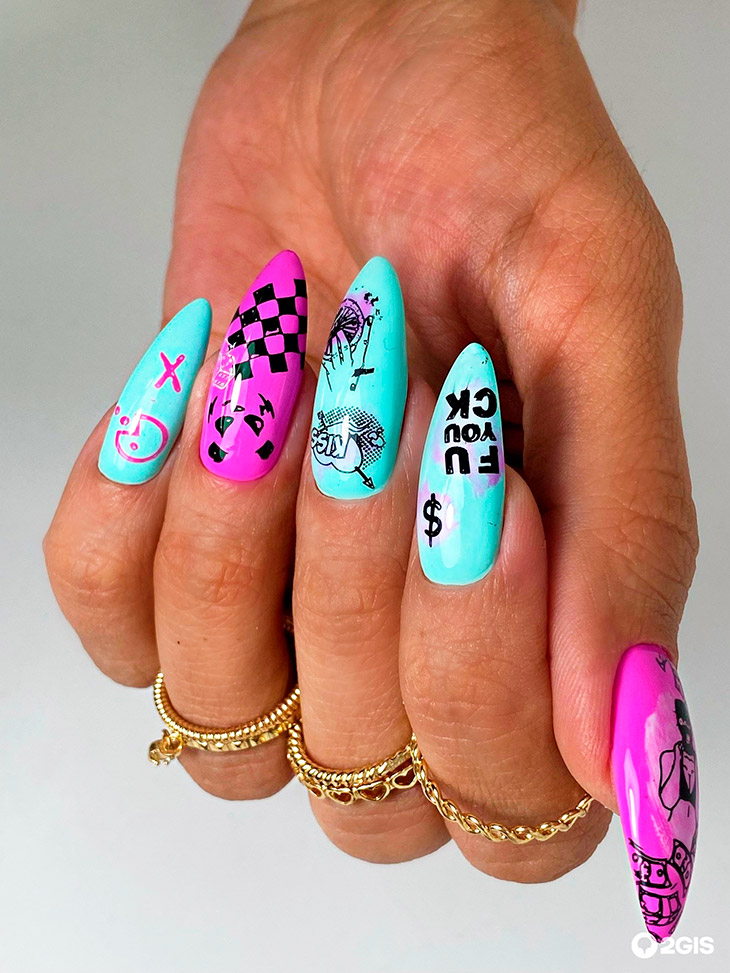 Контрастное оформление миндалевидных пластин в светло-розовой и синей гамме с геометрическим принтом на одном ногте и акриловым напылением на другом – превосходное решение для яркого события!