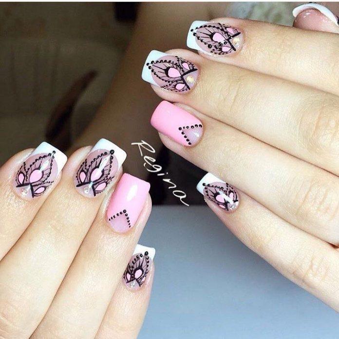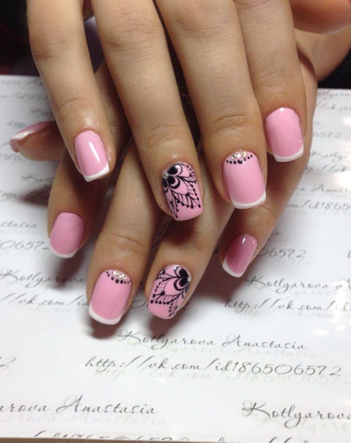 Делать рисунки можно гелями разных цветов. Всё зависит от фантазии и желания. Но лучше всего на розовом цвете смотрятся белый и чёрный. Неброские рисунки можно дополнительно украшать небольшим количеством страз или блёсток – так маникюр станет более ярким, но при этом не вызывающим.