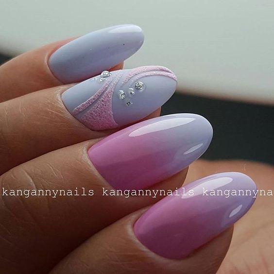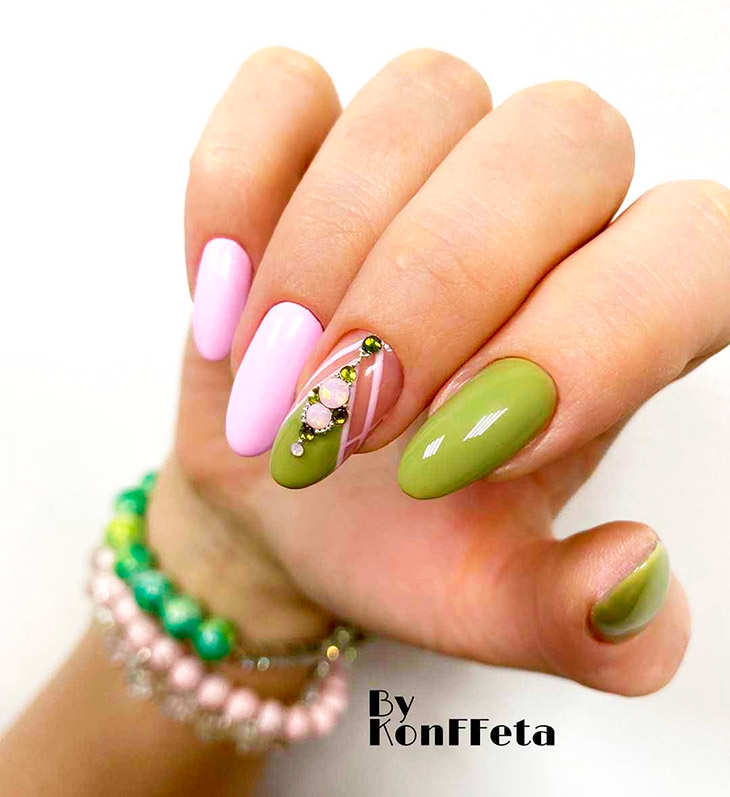 Салатово-розовый выглядит аккуратным. Пастельные тона гармонируют с салтовым. Подойдут рисунки, градиент или декорирование стразами. Главное не утяжелить дизайн, оставляя несколько ногтей в однотонных тонах.
