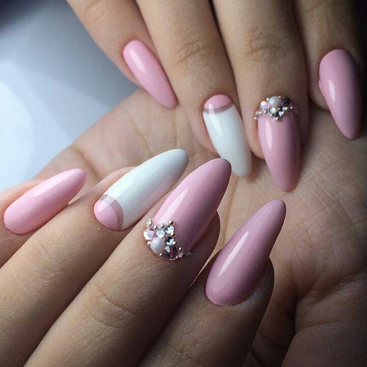 Красиво «рассыпанные» по ноготкам бусины и кристаллы никогда не испортят монохром в маникюре. Идеи оформления стразами розовых ноготков различны: