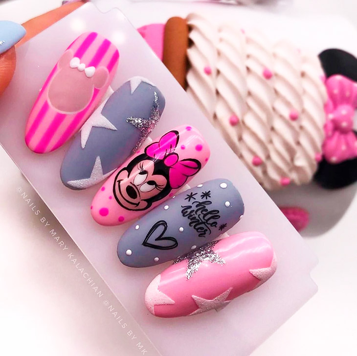 Розовый очень удачно гармонирует с оттенками серого: можно взять этот цвет за основу акцентных ноготков или сделать отдельные штрихи.