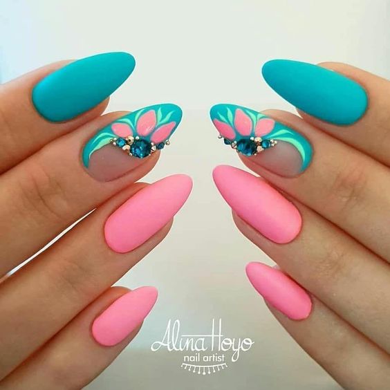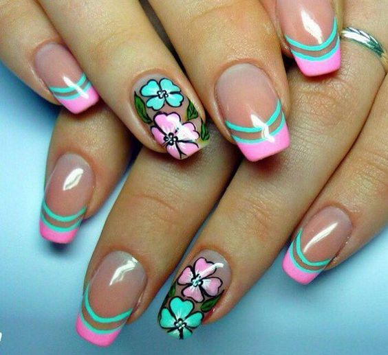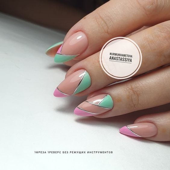 Бирюзовый тон яркий и нежный. Розовый смягчит цвет. Часто оформляют в технике омбре или геометрия, делая бирюзовым основным цветом, а кончики или рисунки на ногтях розовым цветом.