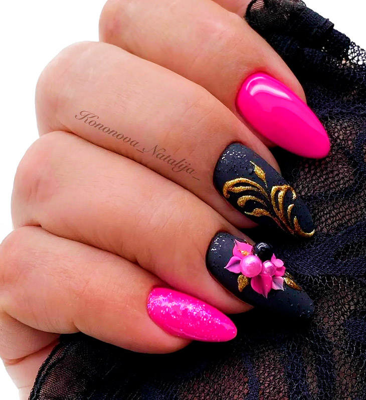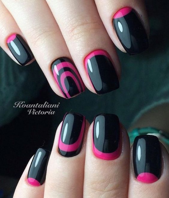 Как мы упоминали выше, розовый прекрасно сочетается с базовыми цветами, одним из которых является черный. В маникюре эта парочка выглядит очень элегантно и стильно, образуя эффект инь-янь: розовый разбавляет глубокий черный, а вместе они балансируют насыщенность и яркость друг друга.