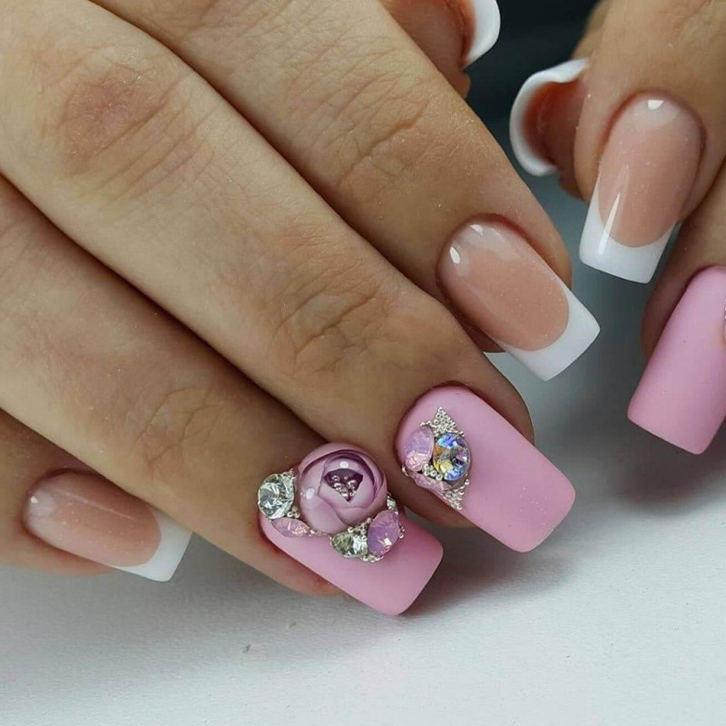 Для особенных событий подойдёт сочетание розового цветочного маникюра с элементами декора:
