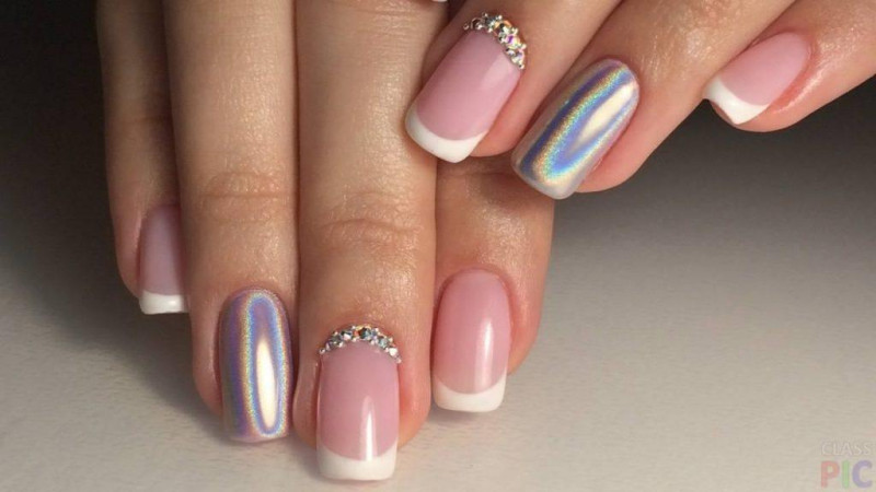 Совсем по-новому может заиграть французский маникюр, если добавить в него немного серебрянных блесток, страз или камушков. Не менее эффектно смотрится плавная растяжка сияющим глиттером или блестящие полоски на матовом фоне. Самые смелые экспериментаторы могут попробовать добиться эффекта омбре. В общем, в этом случае фантазия может быть поистине безгранична.