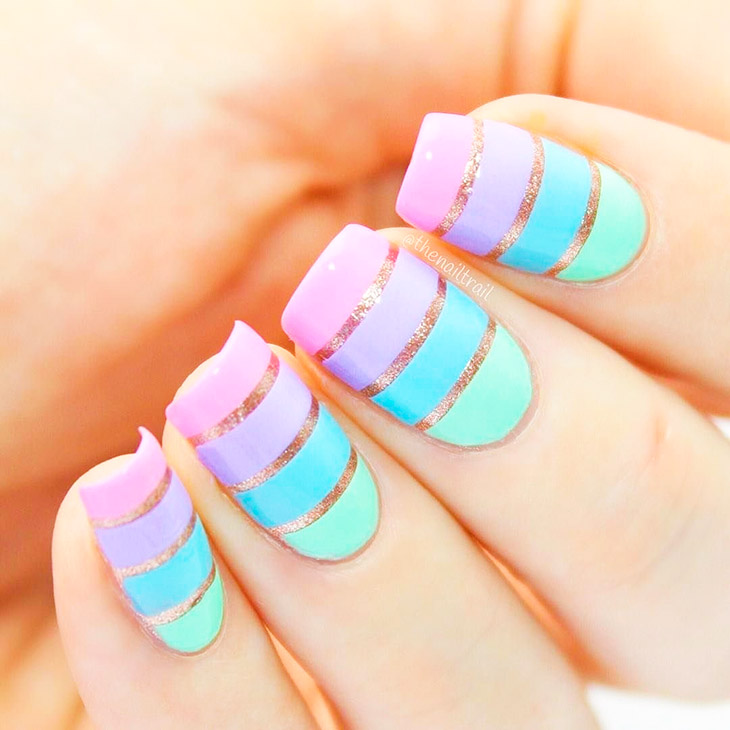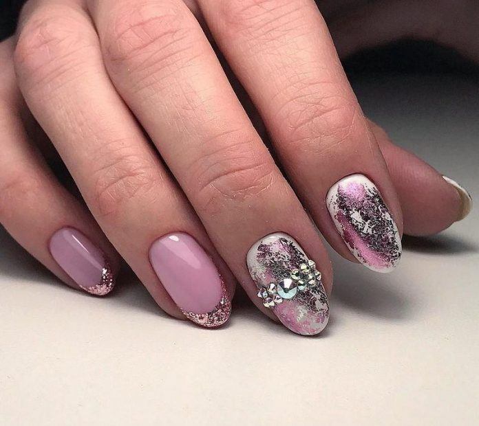 Даже незначительный кусочек блестящей фольги сможет украсить розовый маникюр. Золотистая фольга больше подходит для нюдовых тонов, а разноцветная и серебряная – для более ярких.
