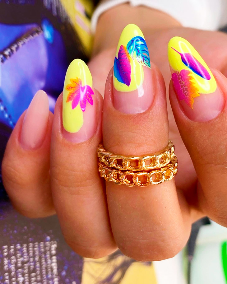 В этом сезоне всё ещё актуально использовать в маникюре различные рисунки. Наиболее популярными элементами в дизайне являются роспись в виде цветов, веточек, бабочек, а также узоры, геометрия и брызги. Рисунками можно декорировать один или сразу несколько ногтей. Уместны также дизайны, в которых рисунки нанесены на все ногти.
