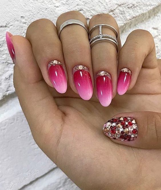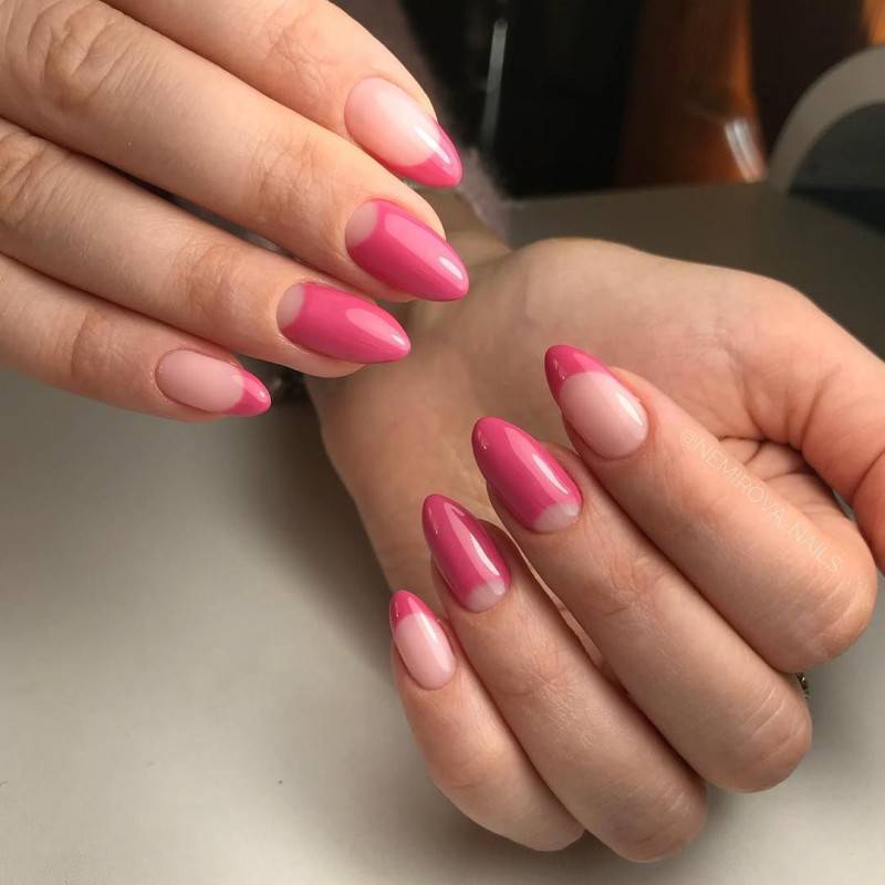 Необычный вариант: ногтевая пластина плавно переходит от ярко-розового к более светлому, а затем к бело-розовому, таким же цветом прорисовывается линия полумесяца у основания ноготка. Нельзя не сказать о розовом френче с эффектом омбре, который всегда очень привлекает модниц.