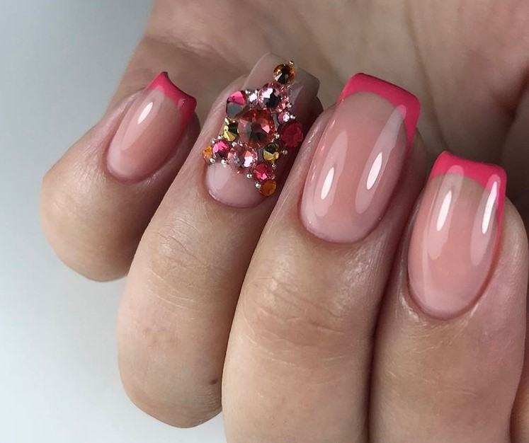 Финальный штрих в розовом маникюре может быть сделан стразами или металлическим декором. Что актуально, модно и много интересных решений. Такие композиции из мелких элементов смотрятся интереснее, но не очень удобны в носке.