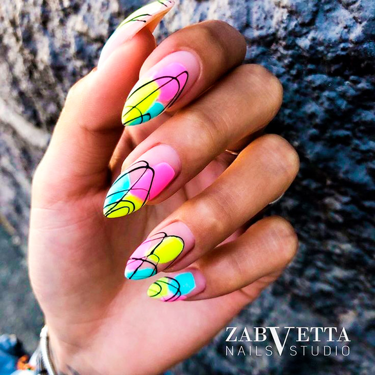 Очень популярным в 2017 году остаётся маникюр с геометрическим дизайном. В тренде различные фигурки: от треугольников до всевозможных зигзагов и полос, объединяющихся в единую композицию. Такой нейл-арт подойдёт для ногтей самой разной длины, но не стоит забывать о том, что в этом сезоне лучше отдать предпочтение коротким и средним ноготкам, воплощающим естественность.