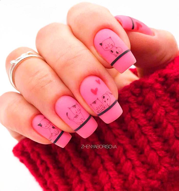 Невероятно красиво подобные гаммы предстают в матовой интерпретации, делая цвет еще более нежным и спокойным. Разнообразить нежно-розовый маникюр с дизайном помогут рисунки и узоры в стиле минимализма: некрупные цветы и листья, полосы, точки.