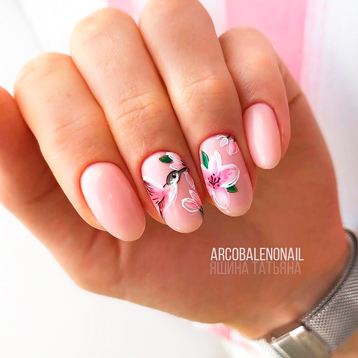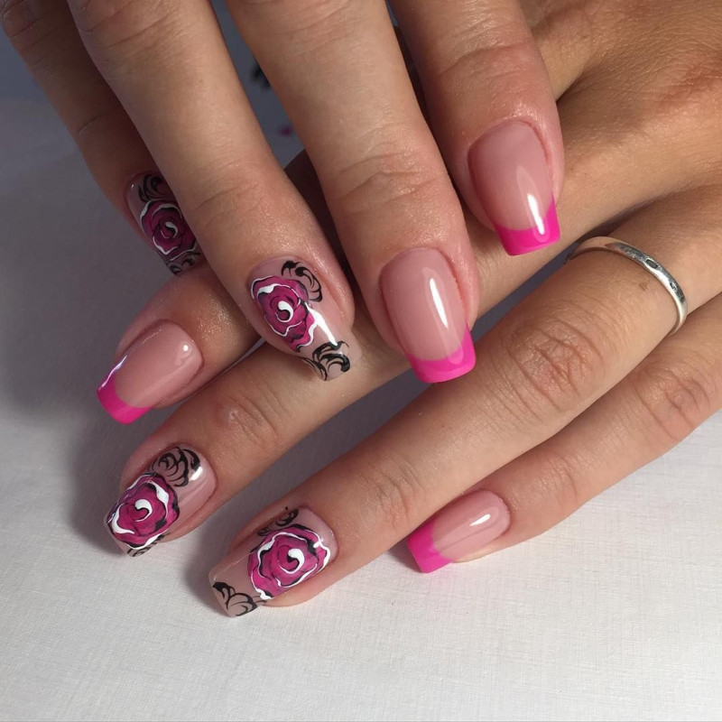 Розовый маникюр с флористическим дизайном может идеально смотреться даже на коротких ногтях или при средней длине пластин: