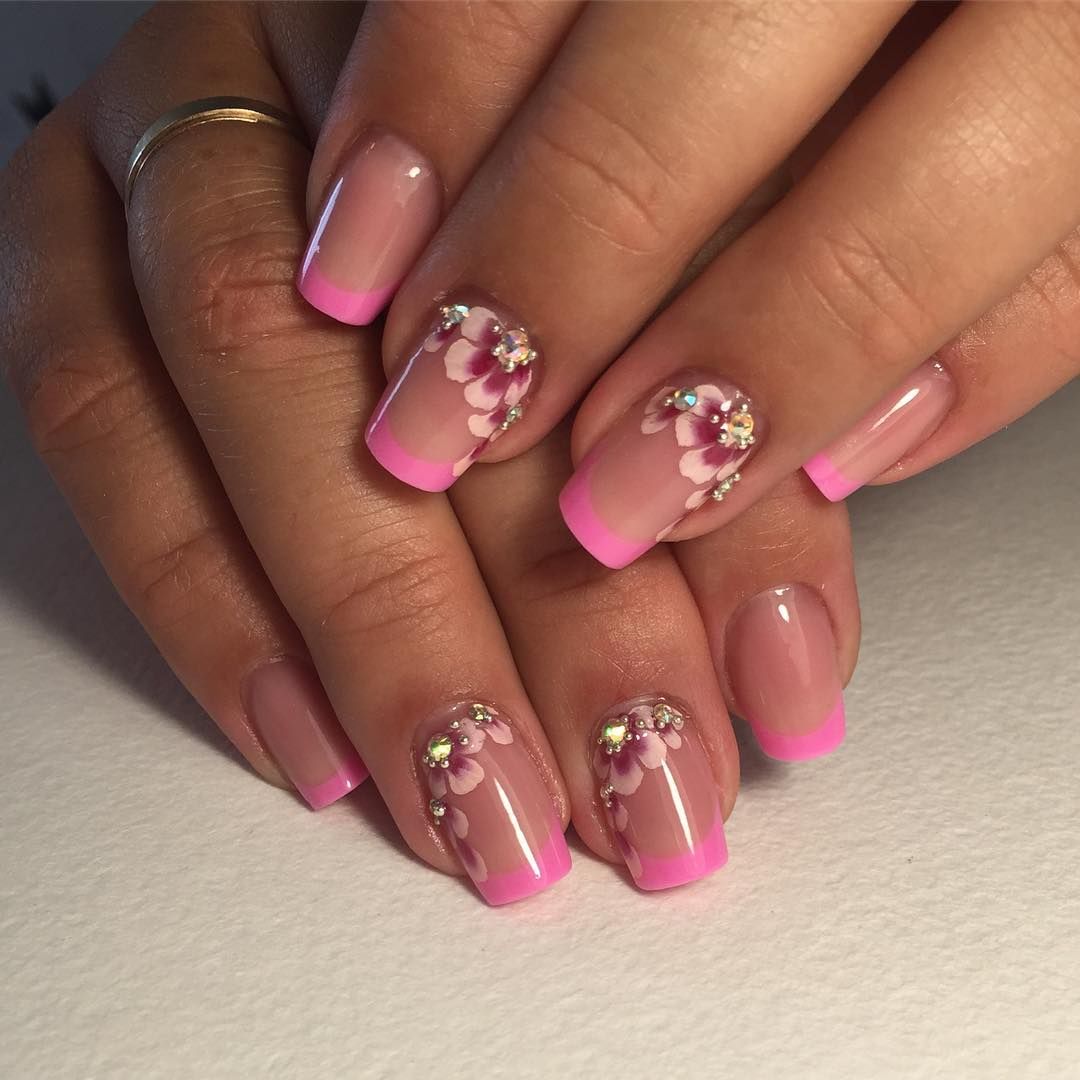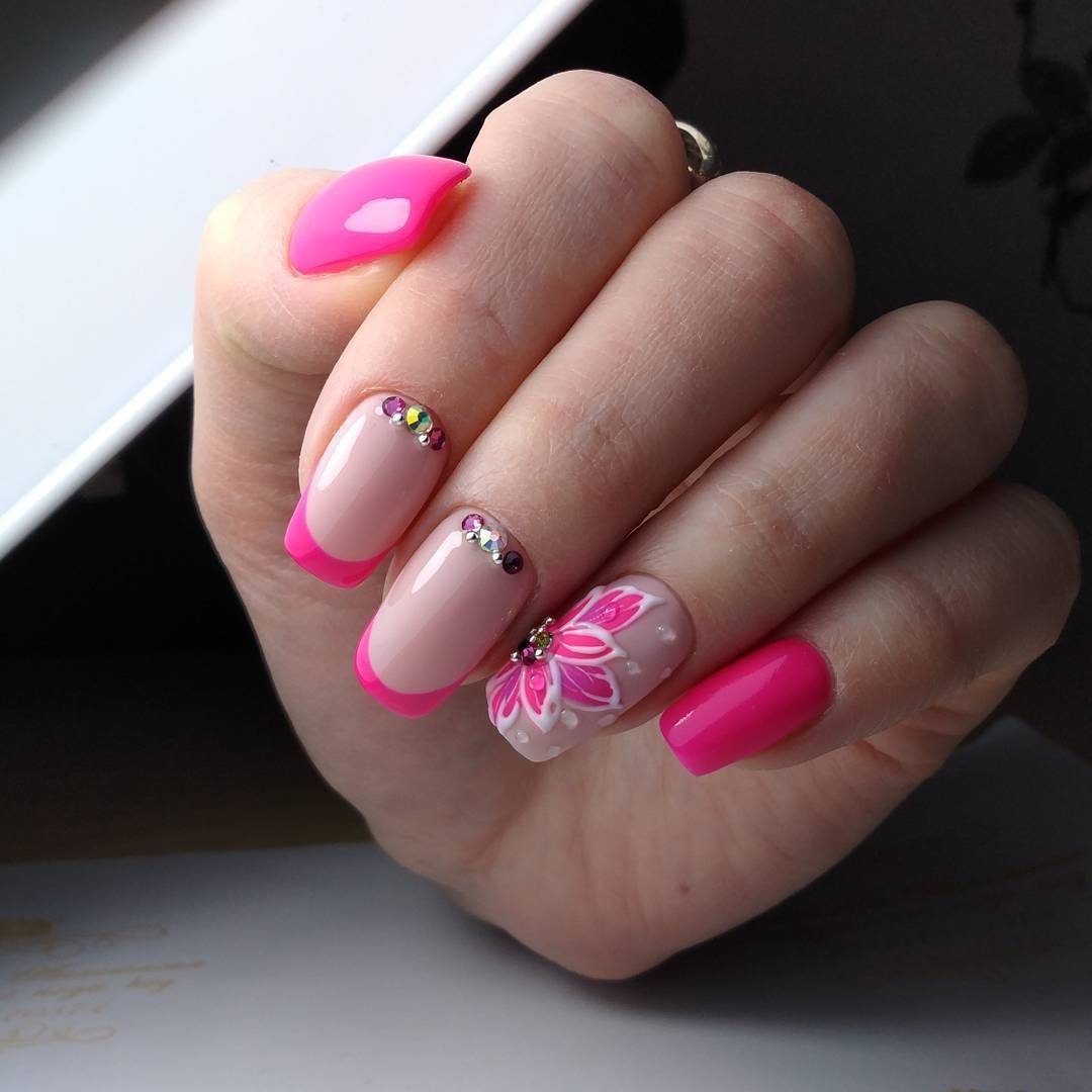 Тем, кто любит обратить на себя внимание и блистать в самом эпицентре праздника, могут понравиться варианты ярко-розового цветочного маникюра, дополненным стразами или блестящим акриловым напылением