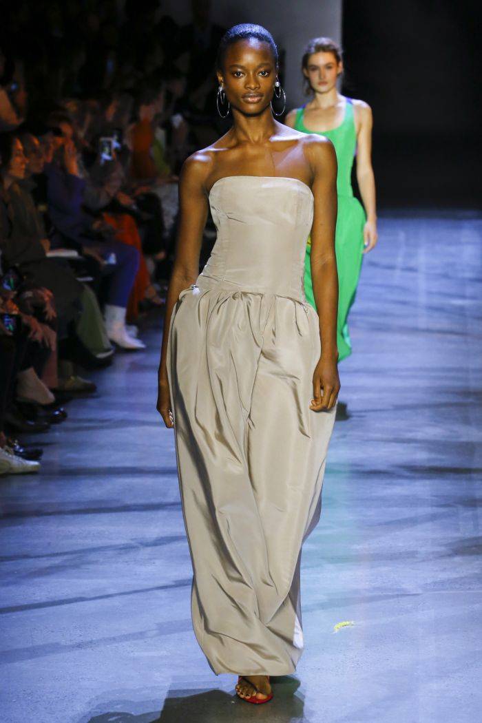 Prabal Gurung представляет образ, основанный на золотом правиле силуэта: если одна часть (верх или низ) пышная, широкая, то другая, противоположная, должна быть узкой, облегающей.