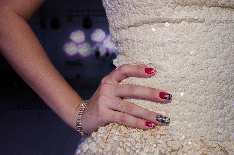 Многие все же не могут отказаться от привычки выбирать лак под цвет вещей. Если у вас однотонное платье яркого кораллового цвета, тоже необязательно красить прямо все ногти в такой же оттенок. Для разнообразия один ноготок на левой и правой руке сделайте с другим оттенком лака, с блестками или интересным рисунком, а сверху покройте его камнями или стразами. Платье белого цвета отлично гармонирует с французским маникюром или же с ногтями, украшенными интересными орнаментами золотистого, серебристого цвета.